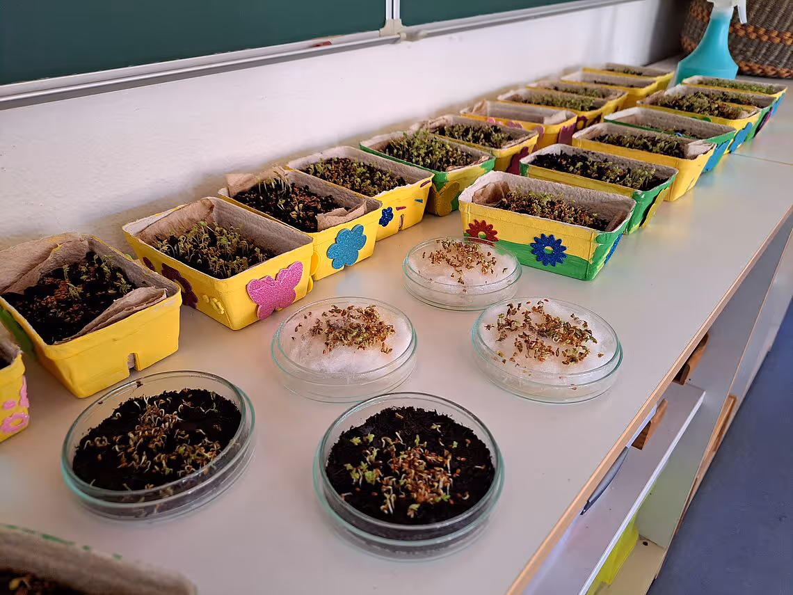 Im Religionsunterricht beschäftigten wir uns im Frühjahr bereits vor Ostern mit dem Symbol Sonne. Wir spürten die Kraft und die Wärme der Sonne am eigenen Körper beim Spiel und bei einer Sonnen-Meditation. Dabei wurde uns ihre besondere Bedeutung für alles Wachsen und Leben auf der Erde bewusst. Wir säten und ernteten unsere eigene Kresse und erlebten anhand eines Versuchs, dass das Wachsen ohne (Sonnen-) Licht nicht funktionierte. Auch das Märchen vom Sonnenvogel beeindruckte uns in diesem Zusammenhang.