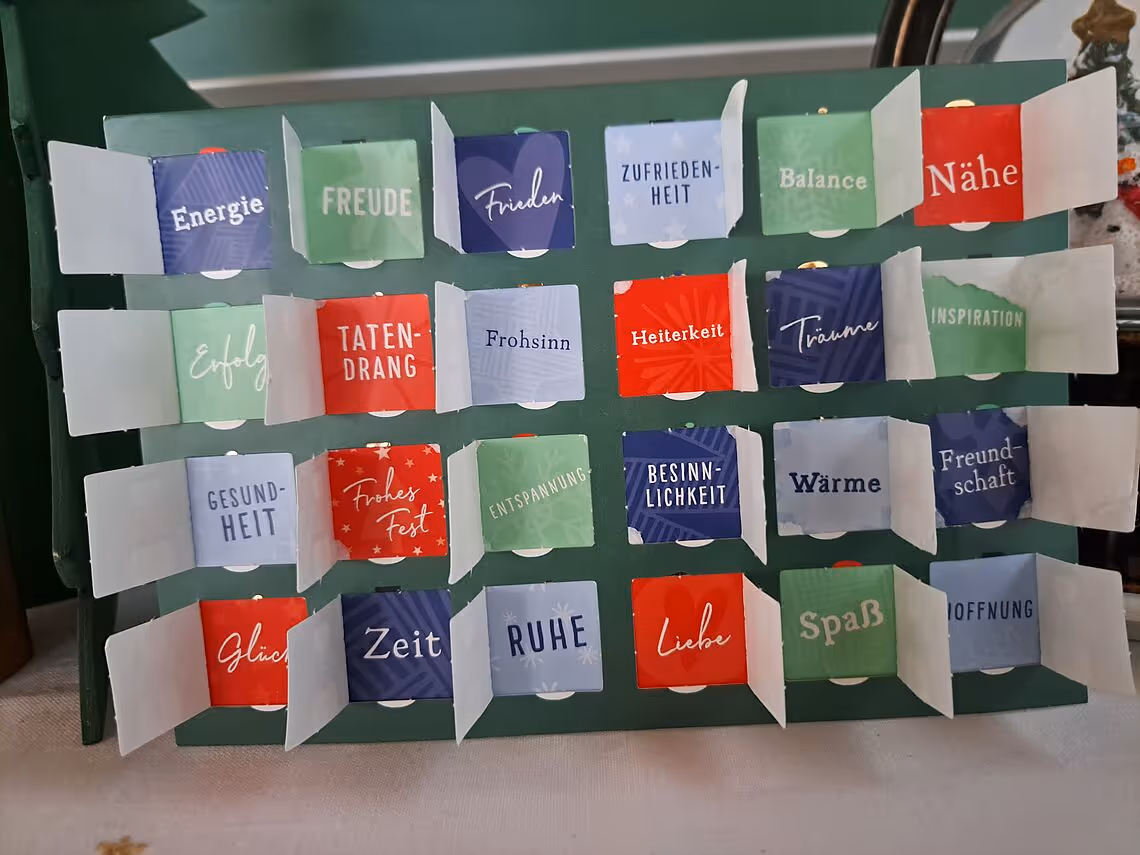 Ebenfalls täglich haben wir dazu 1 von 24 kleinen Türchen mit verschiedenen Schneemann-Motiven geöffnet, in denen Begriffe zu finden waren, über Dinge und Gefühle, die wir uns wünschen.