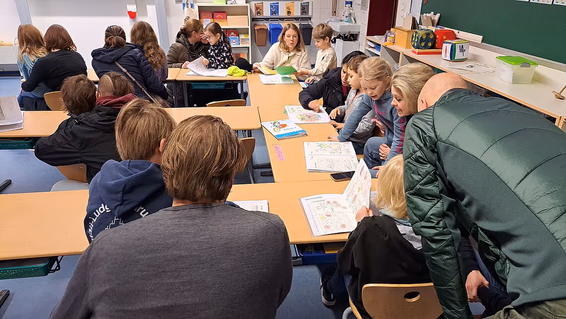 Alle Eltern der Klasse 1 waren herzlich dazu eingeladen, eine „Offene Herbststunde“ gemeinsam mit ihren Kindern zu erleben. Im herbstlich geschmückten Klassenraum gab es mit verschiedenen Herbstliedern und Gedichten ein kleines buntes Programm zu bestaunen, das mit viel Applaus von den zahlreich erschienenen Zuschauern gewürdigt wurde. Besonders spaßig war es auch bei den Herbsträtseln, die von mutigen Erstklässlern für alle Eltern formuliert wurden. Bei korrekter Antwort übergaben die Mädchen und Jungen dann die richtigen Lösungskarten und belohnten ihre Eltern wiederum mit dem verdienten Beifall. Das kleine Programm beendeten wir mit dem gemeinsamen Singen des bekannten Herbstliedes „Hejo, spann den Wagen an“, das wir sogar im Kanon sangen. Zum Schluss nahmen sich die Eltern noch ausreichend Zeit, sich die Arbeitsergebnisse ihrer Kinder aus der Herbstwerkstatt anzuschauen und somit die „offene Herbststunde“ gemütlich ausklingen zu lassen.