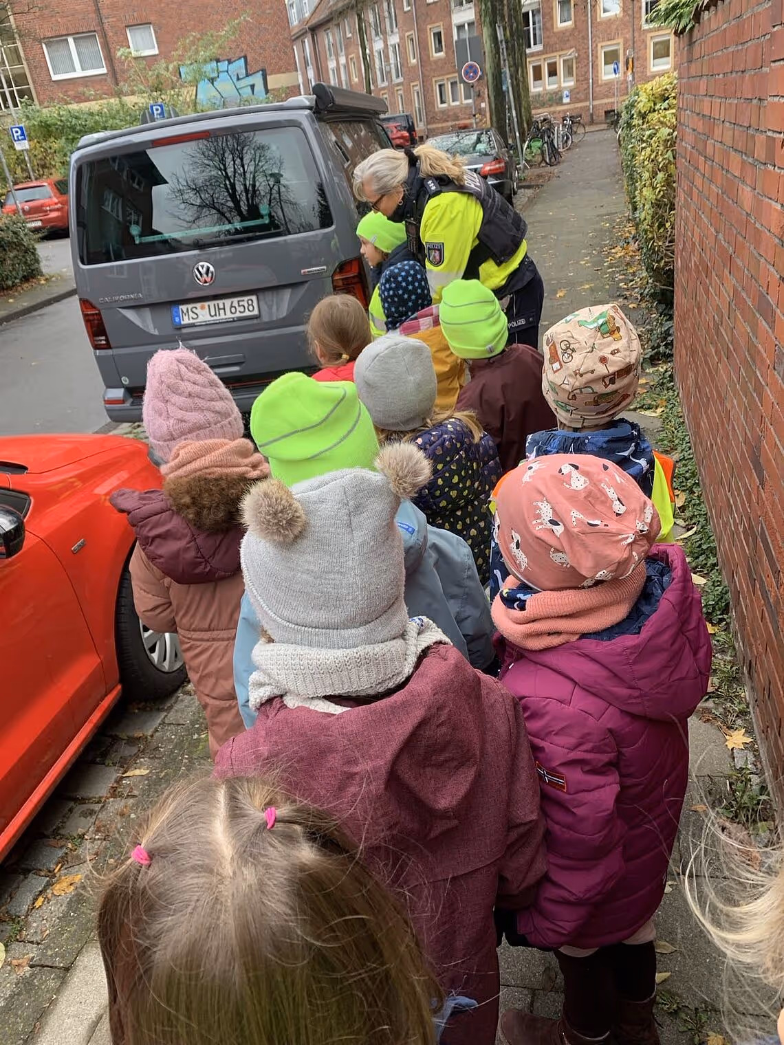 In diesem Herbst hatten wir unser erstes, sehr gutes und wichtiges Treffen mit der engagierten Polizei unseres Bezirks. Gemeinsam machten wir uns Gedanken über spezielle Situationen, die zu herbstlicher Zeit für uns Schulkinder besonders gefährlich sein können. Wir erinnerten uns an die zuvor erarbeitete Thematik aus dem Sachunterricht: dunkle Jahreszeit – helle Kleidung. Dabei erkannten wir die Wichtigkeit von Leuchtwesten sowie Reflektoren und erinnerten uns noch einmal an die Aktion „Münster sieht gelb“… Zusätzlich trainierten wir das Überqueren der Straße zwischen parkenden Autos. Jedes Kind probierte das selber aus: zunächst mit Hilfe der Polizisten, später aber auch mit einem Partnerkind oder sogar ganz alleine. Wir sagen DANKE für die freundliche und geduldige Anleitung und Unterstützung und freuen uns auf weitere Treffen zu anderen Themen!
