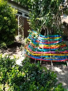 Auf der Rückseite des Schulgebäudes steht uns ein kleines "grünes Klassenzimmer" zur Verfügung. Wenn das Wetter im Sommer gut, können die Kinder in dem Tipizelt spielen, in der Hängematte schaukeln oder sich eigene Buden bauen.